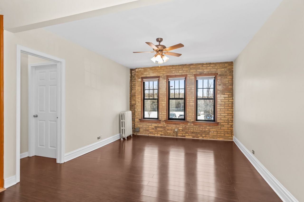Fantastic new offering checking so many boxes! Fabulous 2 bedroom front unit in very well cared for vintage condo building. Three exposures flood this high first floor unit with sunshine. Features include exposed brick walls, in unit laundry, 3 ceiling fans, remodeled bathroom with unique marble detailing, updated kitchen with stainless appliances, granite counters, and solid wood cabinetry, and ample closets. A huge 10 x 22 deeded and heated garage comes with the unit plus an oversized 8 x 4 storage locker. Newer windows, plumbing, electrical, and flooring, freshly painted and in move in condition. Just a few blocks to Red Line CTA, groceries, and neighborhood restaurants, bakery, and more. Charming park and tot lot next door. Investor and pet friendly. So affordable, excellent value.